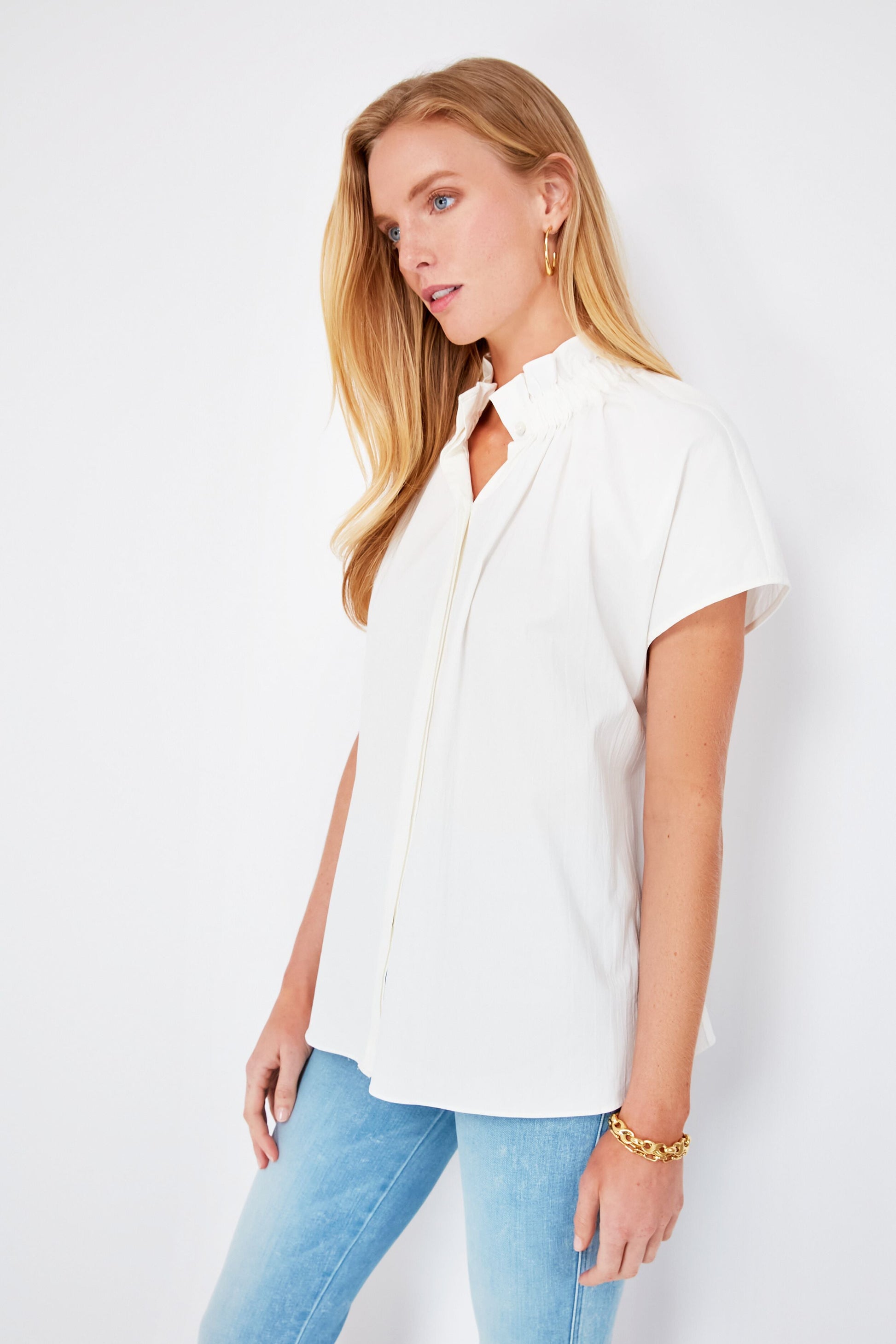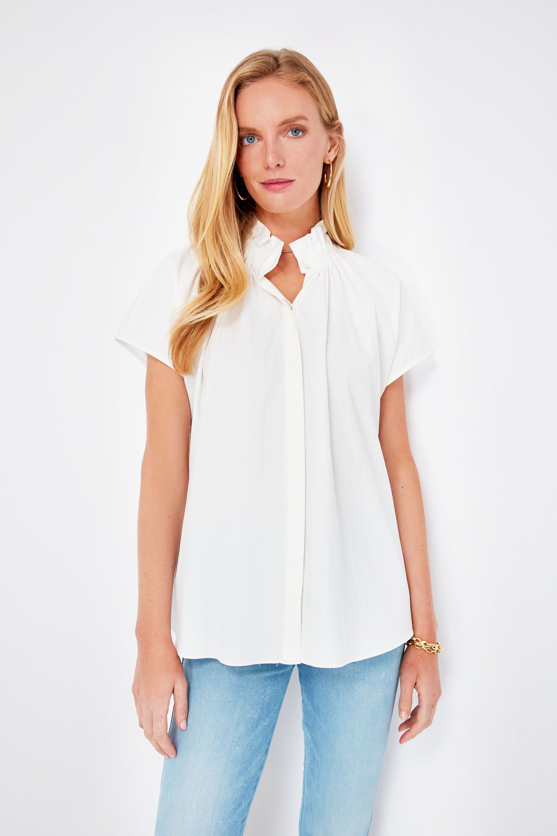 Effortlessly chic, the Rae Blouse takes everything we love about a classic button down and elevates it with fun, feminine details. Featuring a high neck ruffle collar, short cap sleeves, and a button front placket, this crisp white shirt pairs well with denim of all colors and gold jewelry for an effortless day to night look from the office to dining out with friends.