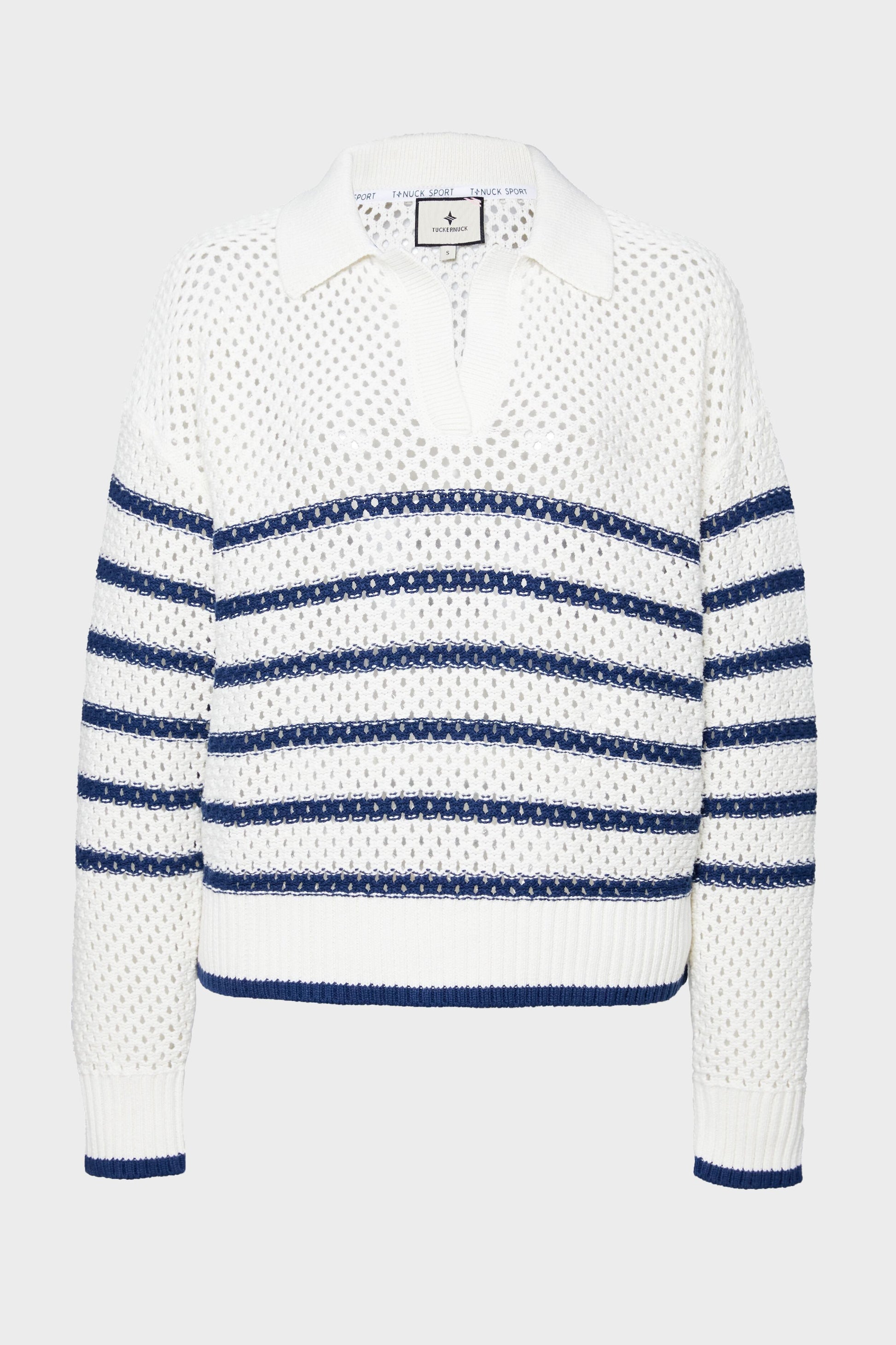 The White Stripe Mesh Fisher Sweater will keep you the perfect temperature this season. With a crochet mesh material and striped pattern, it’s light and breezy. Pair with a tennis dress or with a white tank and jeans for a night by the boardwalk.