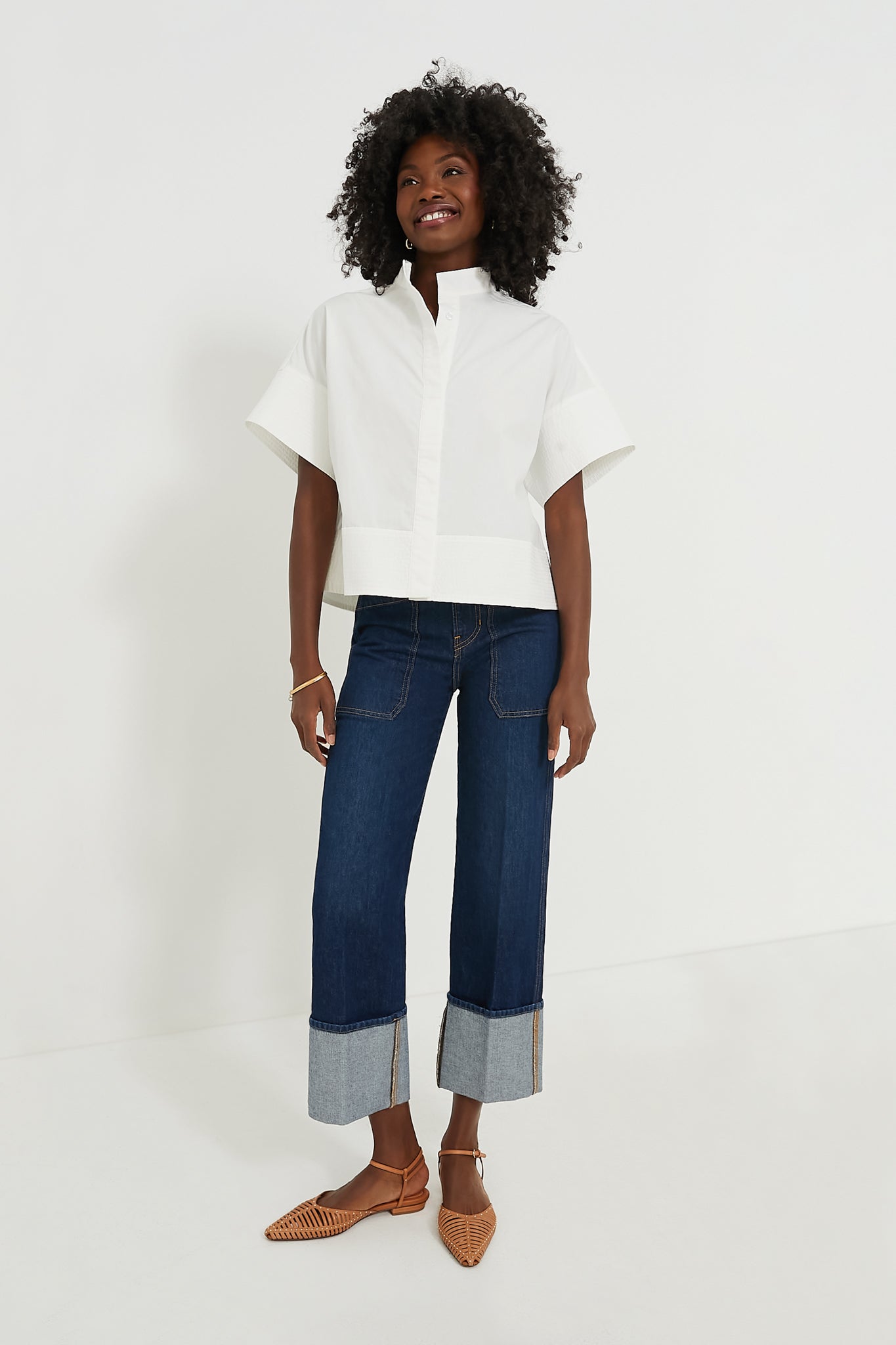The White Sofia Shirt is the elevated style staple your closet needs. A short sleeve button down with a slightly cropped hem and a boxy silhouette that's perfect for pairing with all kinds of bottoms, this style is finished with trapunto stitching that adds an extra-special detail to a classic look. Style with trousers and flats for the office, with a skirt and kitten heels for a dinner date, or with denim and crisp sneakers for weekend wear — this number can do it all.