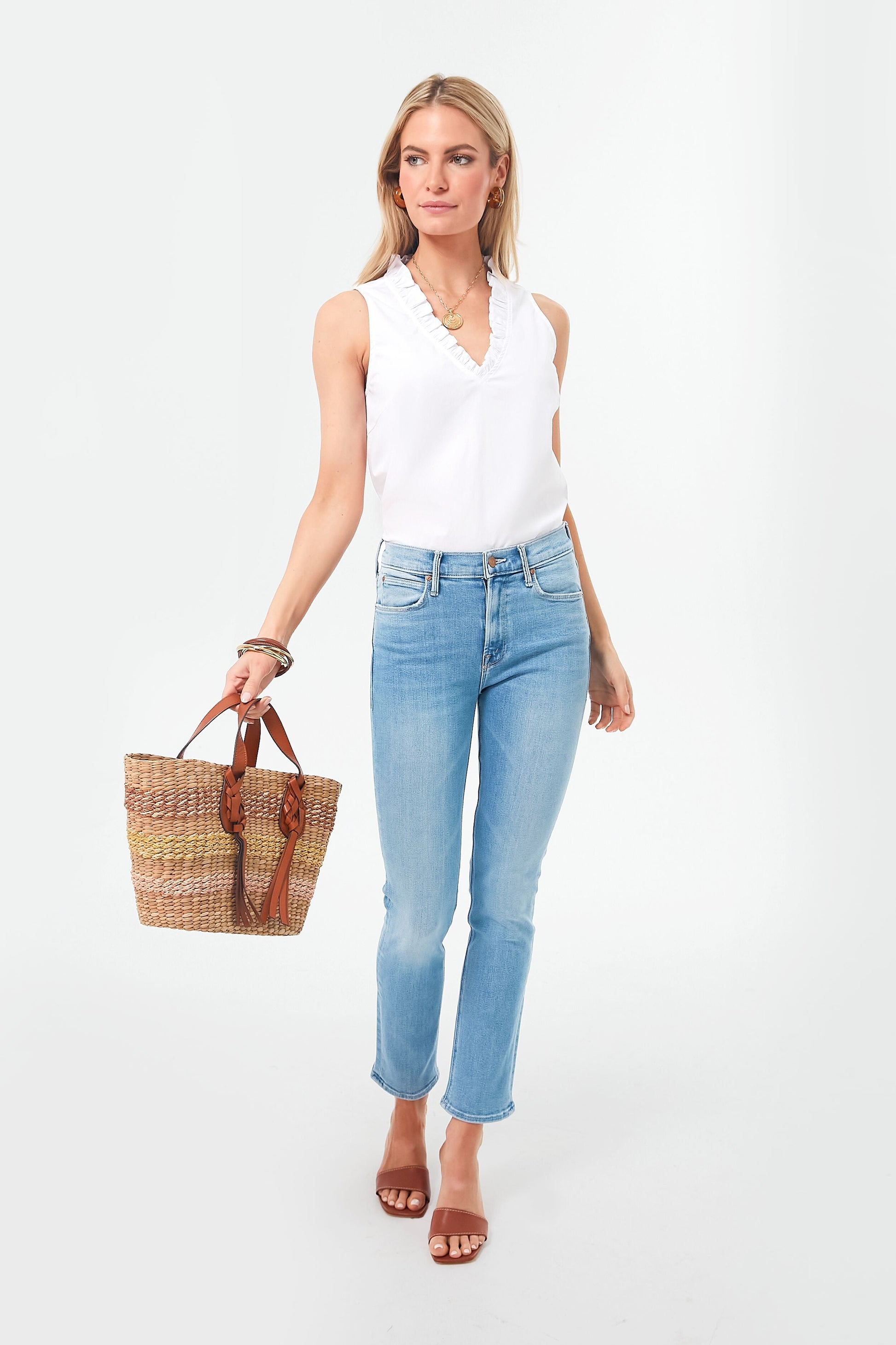 Spring is coming which means florals and fresh whites, queue the Veronica Top. Unfussy and feminine, this blouse features subtle ruffle detailing along the V-neckline for a bit of flirty flair while keeping it sophisticated. We are wearing this sleeveless stunner with denim, trousers, mini skirts (must we go on?) from work to play with ease and style.